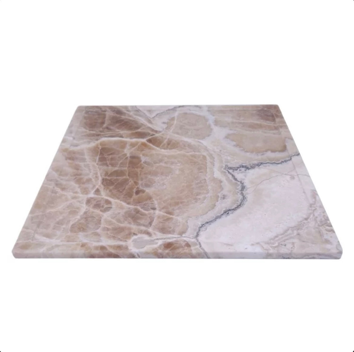 Opvallen dienblad van onyx, gemaakt uit 1 geheel, met groen, blauw en bruin tinten. Style het in het interieur met mooie accessoires erop.