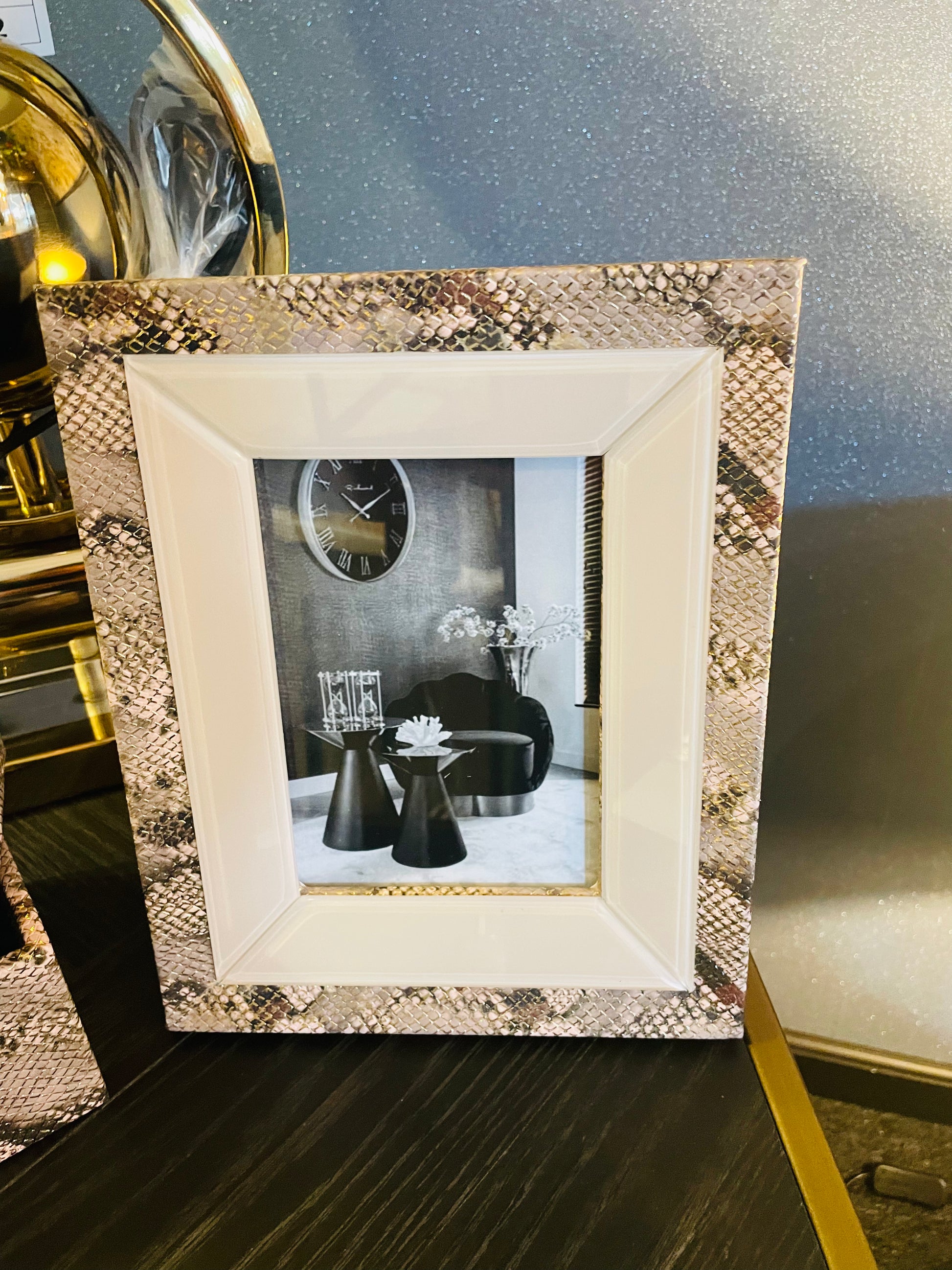 De Janna Fotolijst kleedt de planken en muren aan met onvergetelijke herinneringen, unieke momenten en belangrijke mensen in jouw leven. Gemaakt van MDF en suede met een slangenprint. Het ontwerp past perfect bij elke decoratieve stijl en laat jouw fantasie de vrije loop.