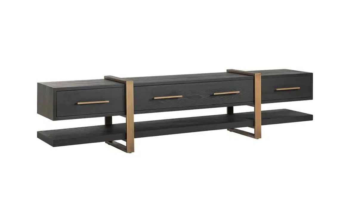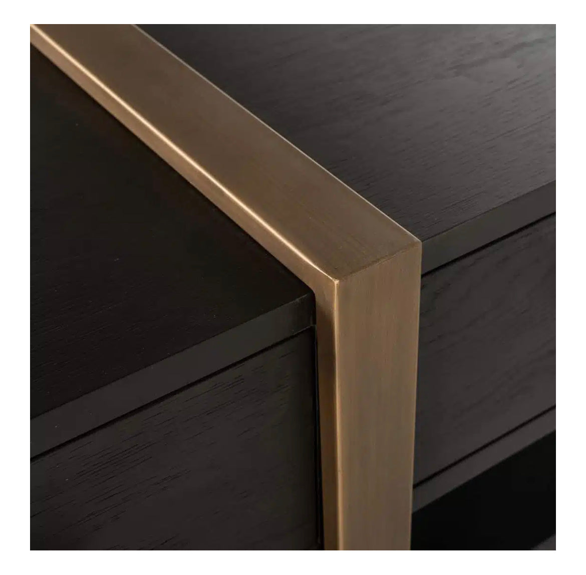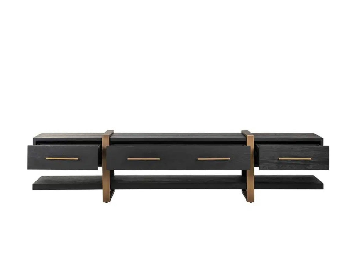 Richmond Interiors creëert stijlvolle meubelen en accessoires die net zo uniek zijn als jij. Elke collectie staat garant voor een moderne uitstraling met een chique touch. Tv meubel combineert donker koffiekleurig eikenfineer met messing details op een verfijnde manier.informeer naar de leverdatum