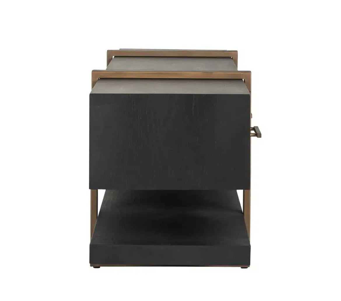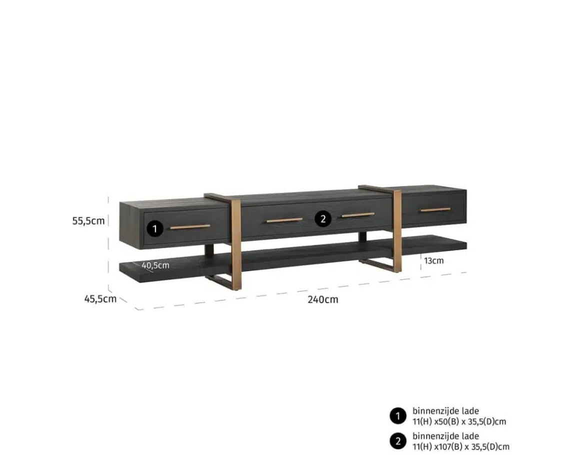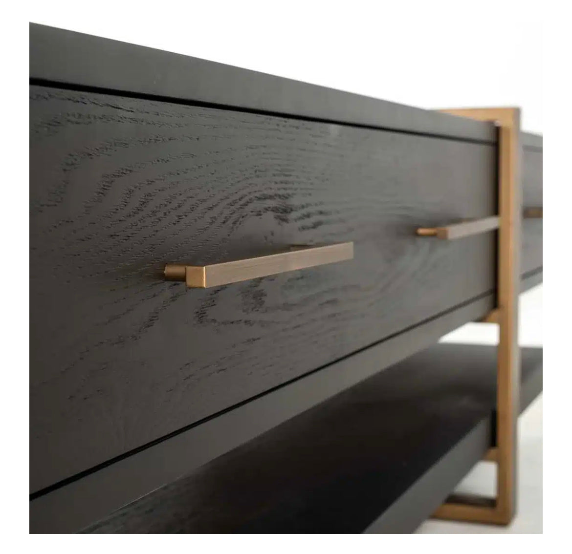 Richmond Interiors creëert stijlvolle meubelen en accessoires die net zo uniek zijn als jij. Elke collectie staat garant voor een moderne uitstraling met een chique touch. Tv meubel combineert donker koffiekleurig eikenfineer met messing details op een verfijnde manier.informeer naar de leverdatum
